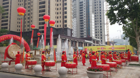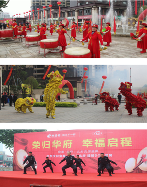 鑼鼓齊鳴迎盛事,舞獅威猛慶歡樂,5月9日,沂州路和金一路交匯處臺(tái)地園林入口,彩旗林立,噴泉輝映,在喜慶的鑼鼓聲中,金泰華府·北府(2#5#6#7#9#)提前六個(gè)月拉開了交房的帷幕。