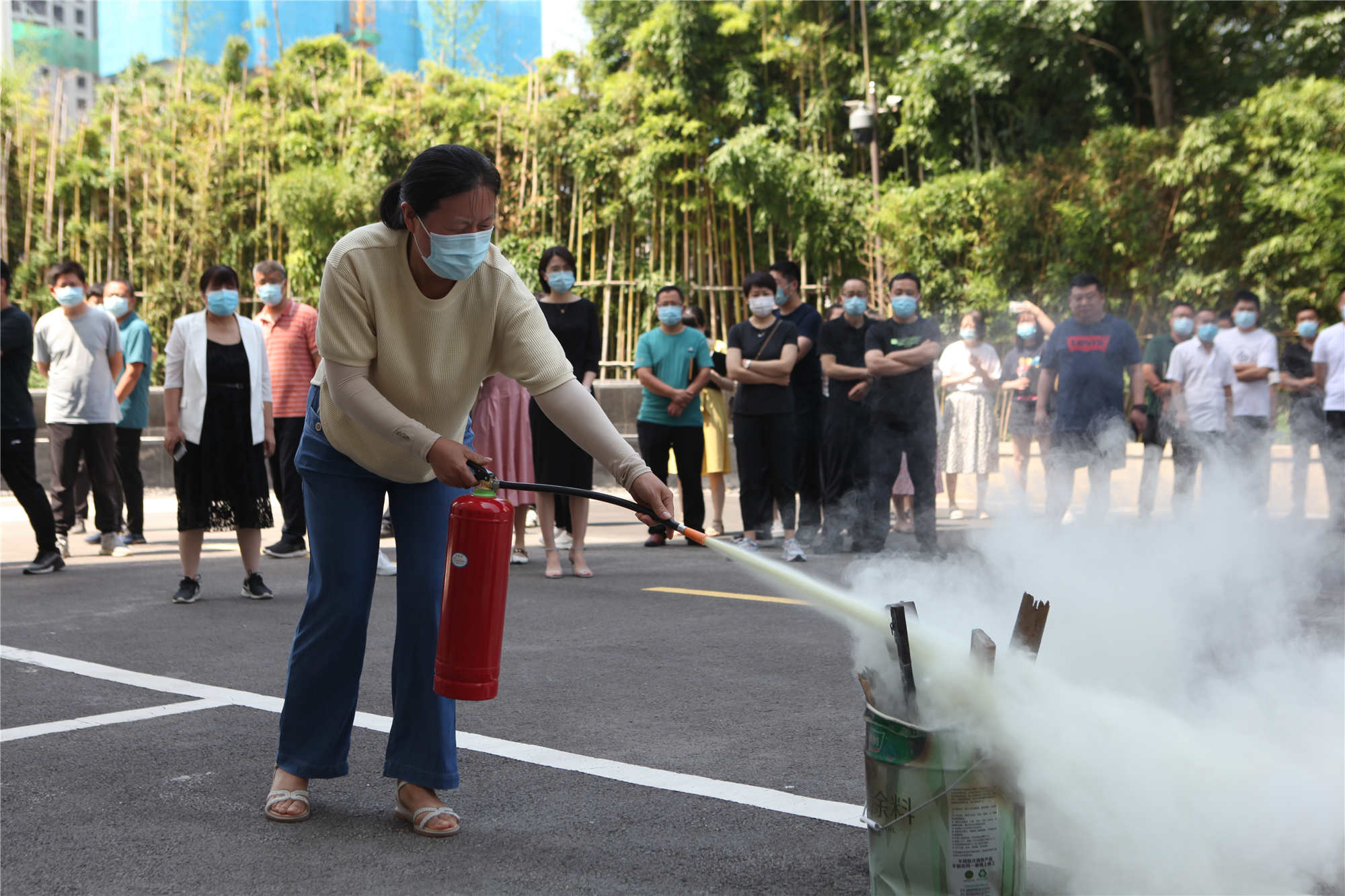 公司員工現(xiàn)場(chǎng)演練使用干粉滅火器滅火