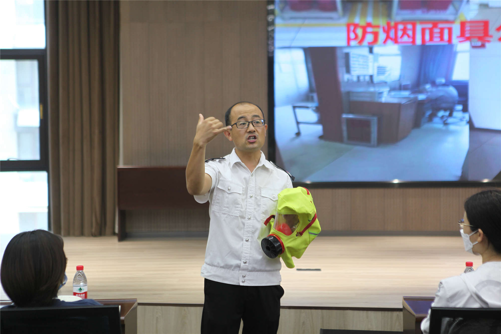 居安消防高級(jí)教員李國(guó)慶講解防煙面具的正確用法